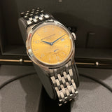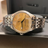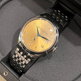 Priemer 41 mm. Hrúbka 11.54 mm. Puzdro a náramok z nehrdzavejúcej ocele. Hladký rám z ocele. Zlatý ciferník Sunburst s arabskými číslicami. Modré ruky. Zafírové sklíčko. Automatický pohyb. 38h rezerva chodu. Priehľadné puzdro vzadu. Originálna dvojitá skladacia spona Baume & Mercier z ocele.